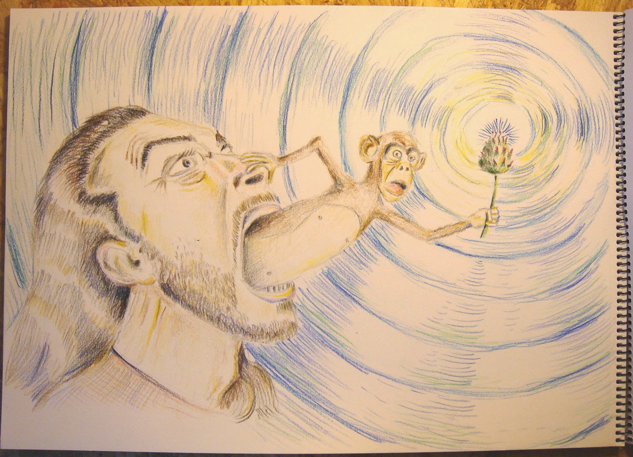 No era necesario incluir todos los objetos, así que me limité a dibujarme a mí, al animal (un cariacontecido chimpancé), una bonita flor (la flor de la alcachofa) y un fenómeno atmosférico (remolino marítimo) el cual no ha quedado del todo realista, ejem, ejem.