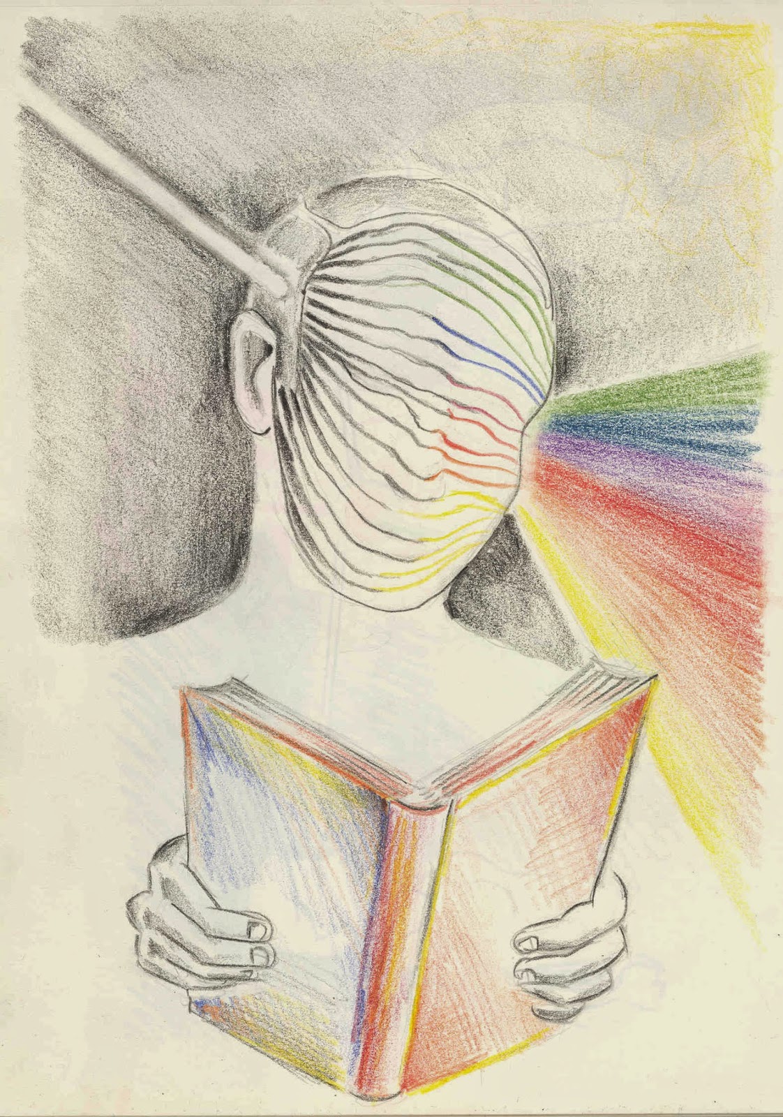 Para finalizar, adjunto el primer boceto que realicé para este trabajo, y que poco tiene que ver con los ya mostrados; en este caso jugaba con la dispersión de la luz como metáfora del nacimiento de una idea a través del conocimiento… o algo así… creo.